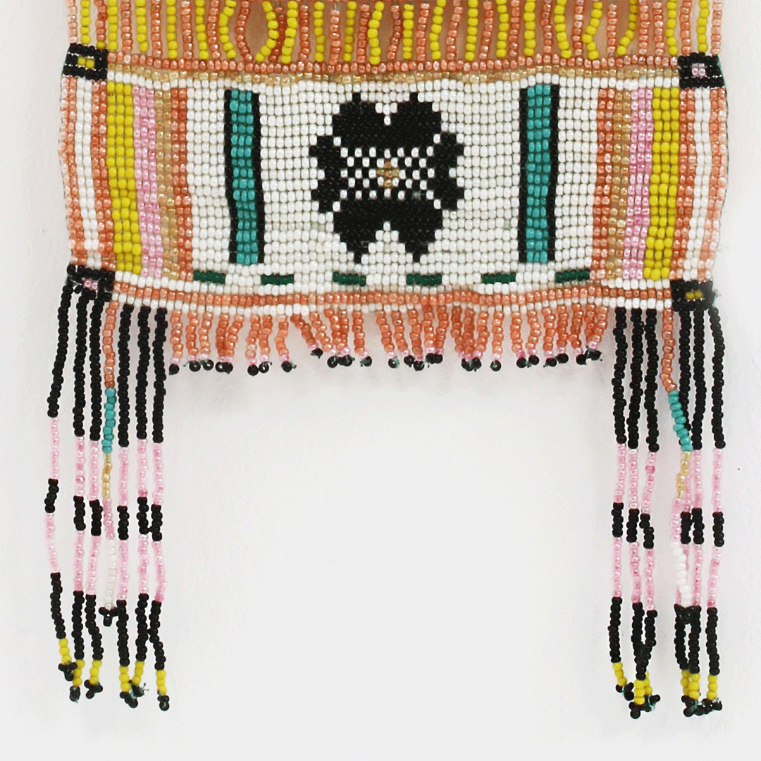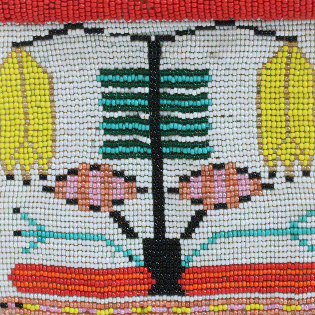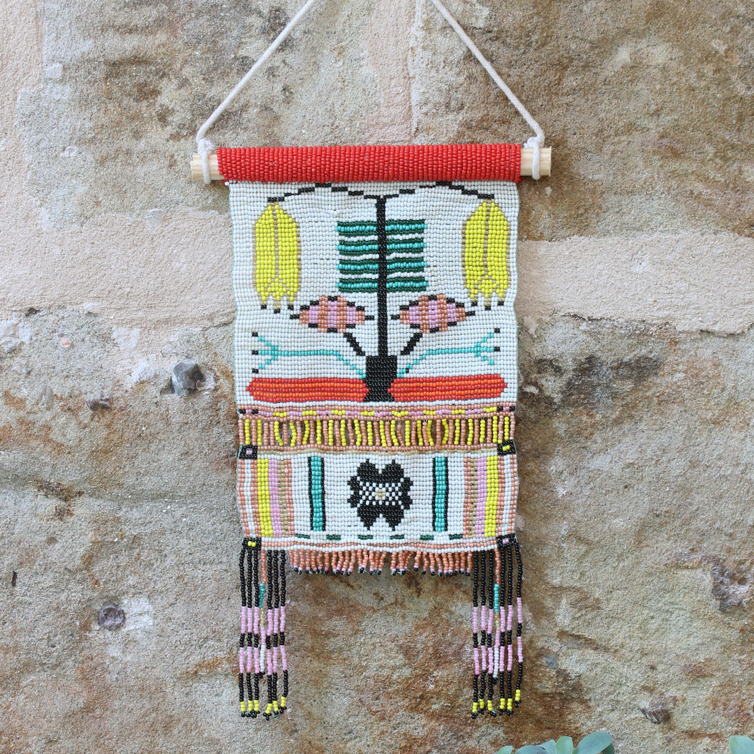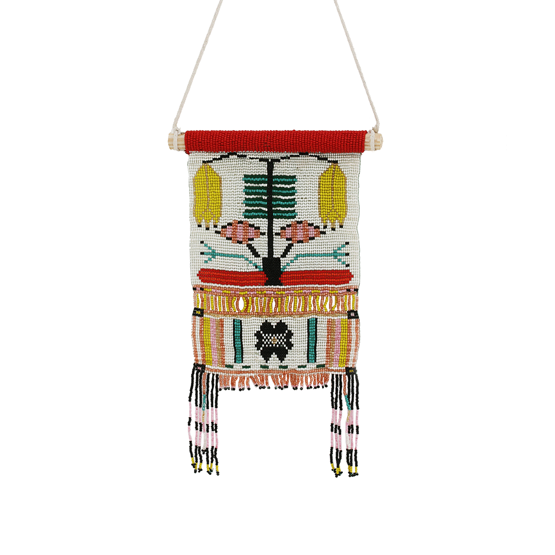 Chaque perle, patiemment cousue en Inde, compose un bouquet vibrant de symboles et de couleurs — un jardin figé dans la délicatesse.