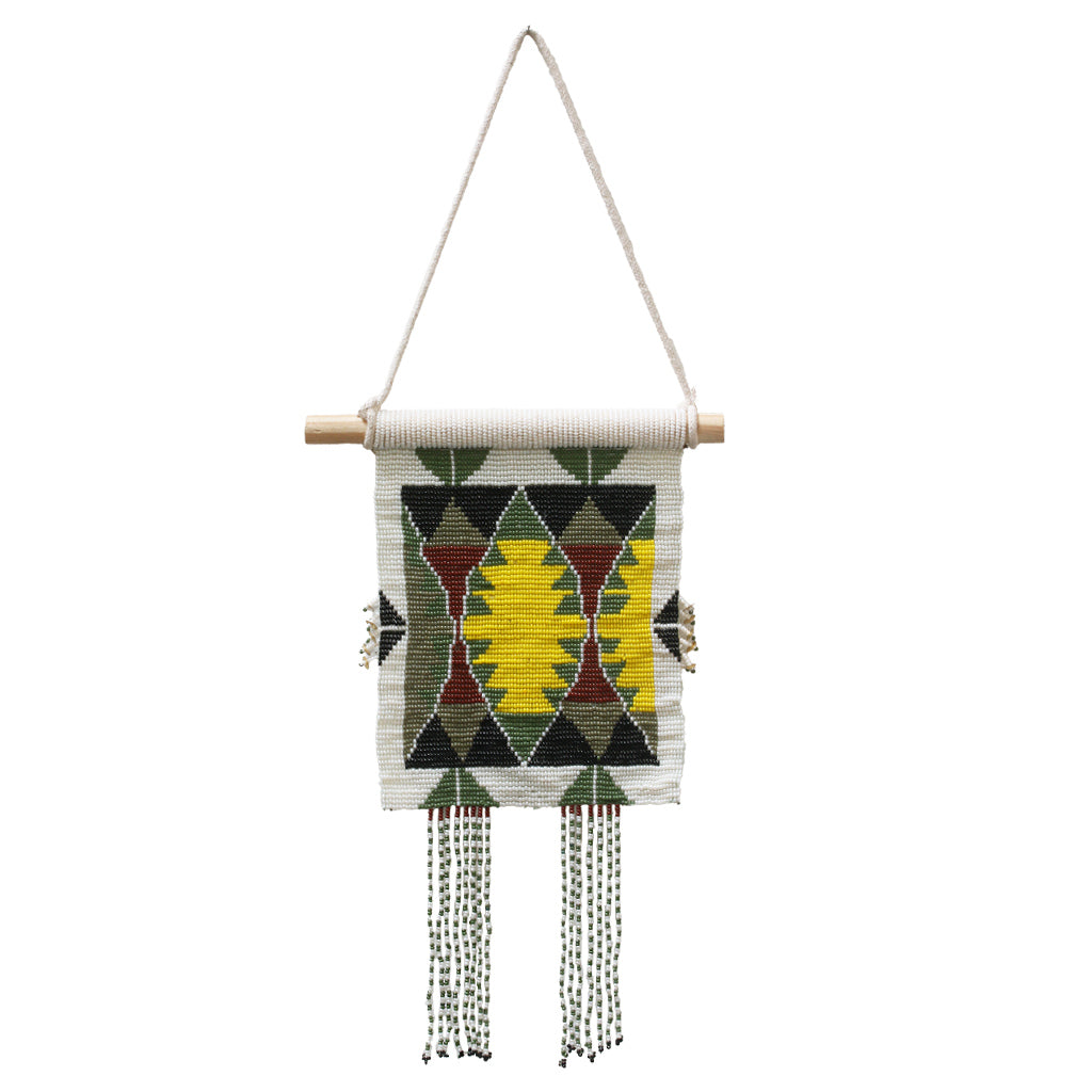 Chaque perle, patiemment cousue en Inde, compose un bouquet vibrant de symboles et de couleurs — un jardin figé dans la délicatesse.